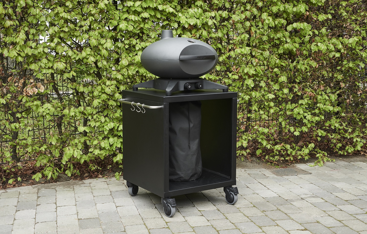 Bøjlerne fungerer desuden som diskret og praktisk ophæng til forskelligt grillredskaber. Kabinettet er udført i pulverlakeret, galvaniseret stålplade, der med sin lidt grove tekstur tilpasser sig støbejernets velkendte overflade.